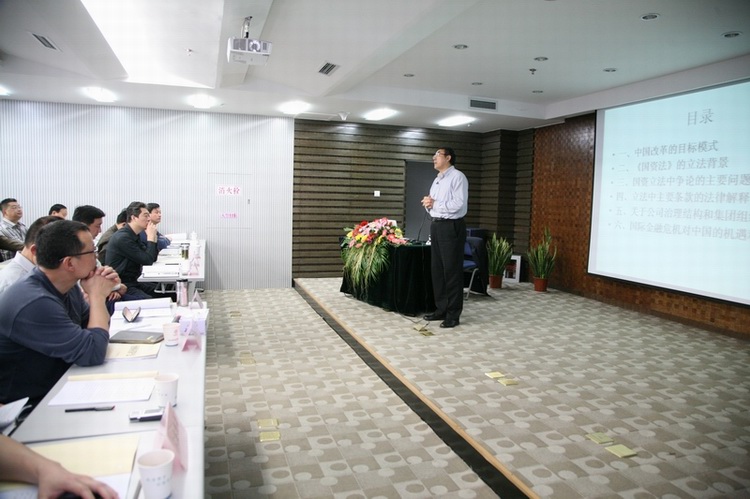 劉紀(jì)鵬教授對(duì)中國(guó)改革的目標(biāo)模式、國(guó)資改革中的政府定位、《國(guó)有企業(yè)資產(chǎn)法》的立法背景、立法中爭(zhēng)論的主要問題、主要條款的法律解釋等問題做了深入的講解,并對(duì)參會(huì)人員提出的疑問做了認(rèn)真的解答。此外,他還就國(guó)際金融危機(jī)對(duì)中國(guó)發(fā)展的機(jī)遇和挑戰(zhàn)提出了自己的獨(dú)到見解。