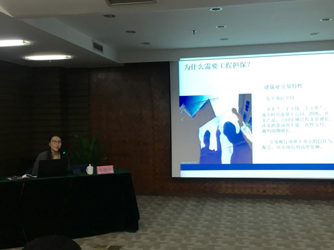 合肥國控?fù)?dān)??偨?jīng)理助理、商業(yè)擔(dān)保部經(jīng)理張曉敏對工程履約擔(dān)保業(yè)務(wù)進(jìn)行了全面解析,并重點介紹了履約擔(dān)保、投標(biāo)擔(dān)保、預(yù)付款擔(dān)保、質(zhì)量保證擔(dān)保等業(yè)務(wù)產(chǎn)品以及風(fēng)險管理和業(yè)務(wù)創(chuàng)新等方面業(yè)務(wù)知識。